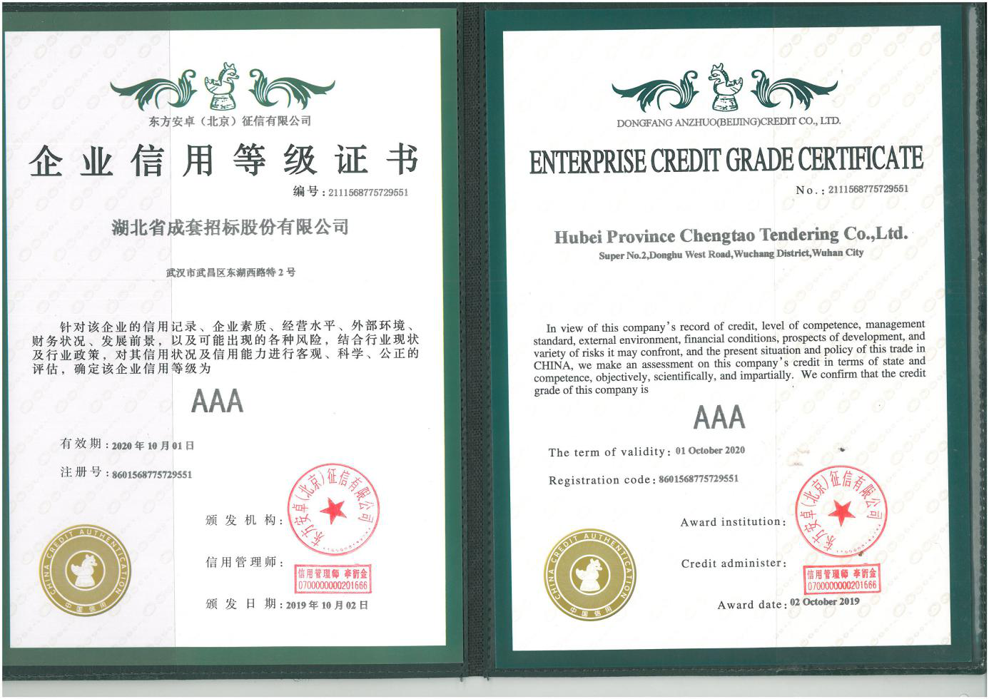 企業(yè)信用等級(jí)AAA證書