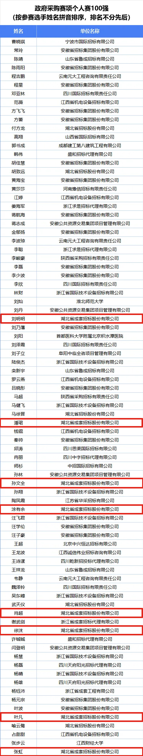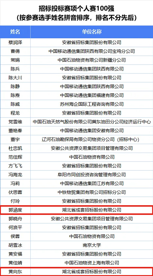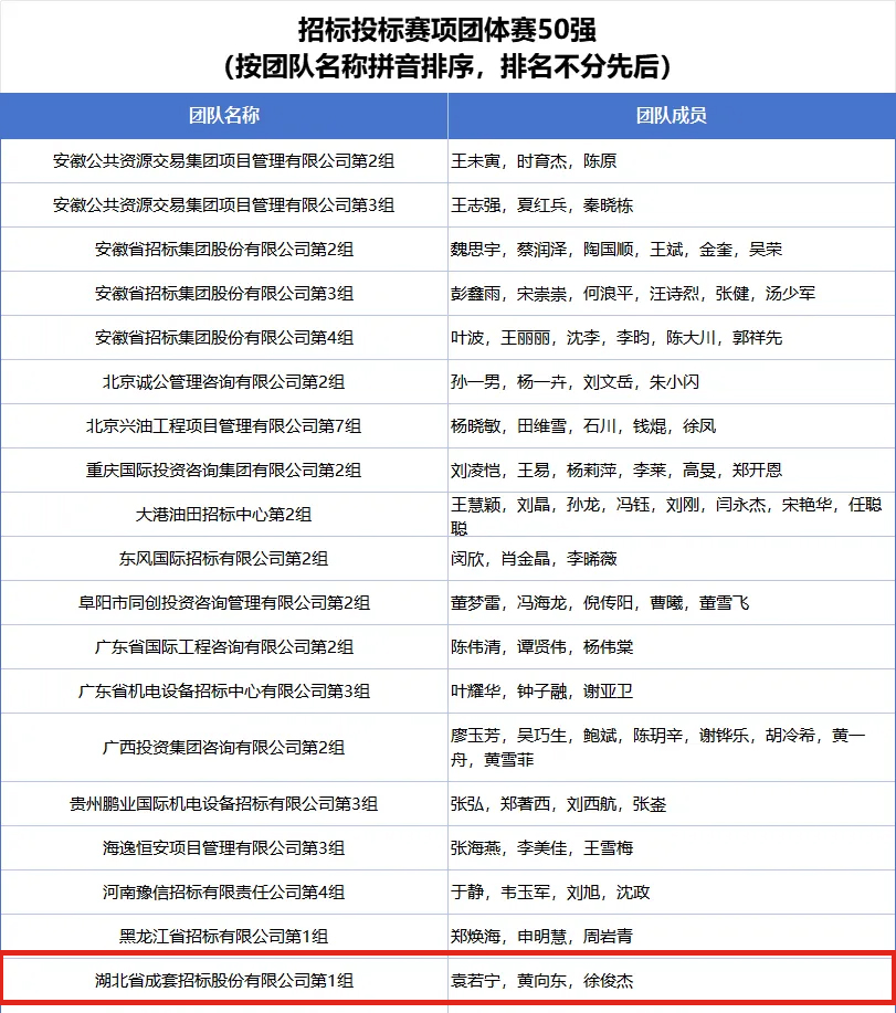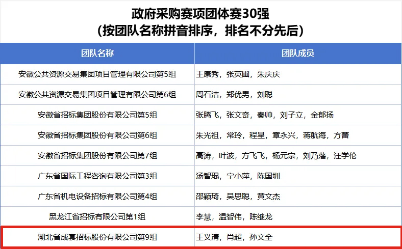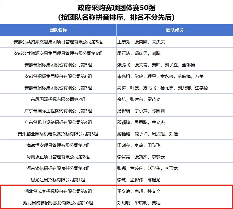 公司第一組團(tuán)隊(duì)袁若寧、黃向東、徐俊杰入圍全國招標(biāo)投標(biāo)賽項(xiàng)團(tuán)體賽50強(qiáng)榜單;公司第九組團(tuán)隊(duì)王義清、肖超、孫文全入圍全國政府采購賽項(xiàng)團(tuán)體賽30強(qiáng)榜單;公司第十組團(tuán)隊(duì)劉明明、畢啟明、莫程入圍全國政府采購賽項(xiàng)團(tuán)體賽50強(qiáng)榜單;公司參賽選手郭涵度、黃向東入圍全國招標(biāo)投標(biāo)賽項(xiàng)個人賽100強(qiáng)榜單;公司參賽選手劉明明、潘珺、孫文全、涂有余、肖超、徐沫、葉凡、張虹入圍全國政府采購賽項(xiàng)個人賽100強(qiáng)榜單。
