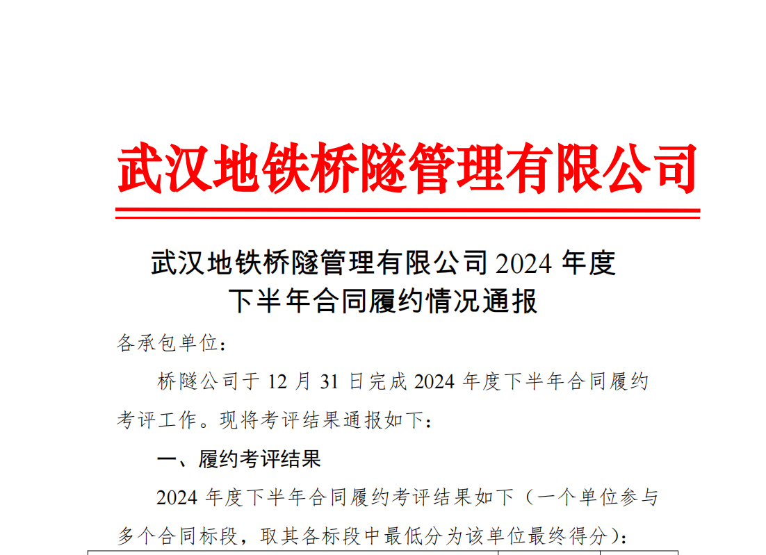 近日,武漢地鐵橋隧公司公布2024年度招標(biāo)代理單位合同履約情況考評結(jié)果,省成套招標(biāo)公司以高分通過考評,再次獲得優(yōu)秀等次。